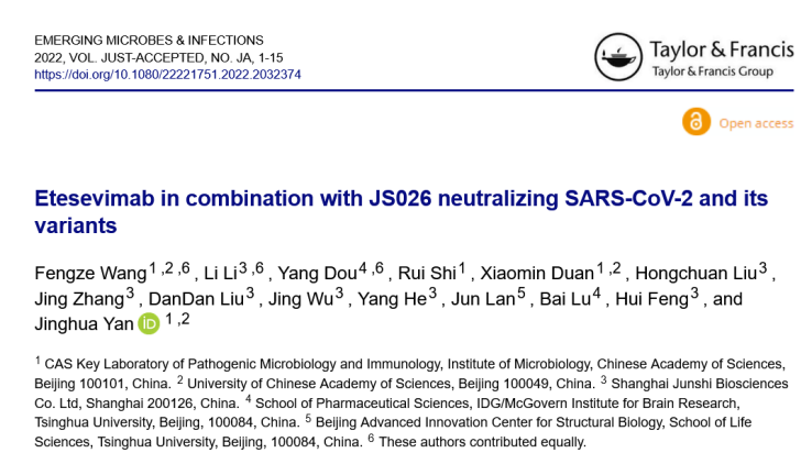 鲁白/豆扬/诺唯赞生物团队还与上海君实生物医药科技股份有限公司首席运营官冯辉博士团队合作开发了高效中和抗体JS026注射液。JS026注射液可以和中国科学院微生物研究所严景华团队/君实生物开发的中和抗体埃特司韦单抗(JS016或etesevimab)配对组成鸡尾酒疗法。研究显示,JS026与埃特司韦单抗联合用药能够中和多种新冠病毒变异体的同时还具有协同中和效果。目前,埃特司韦单抗已在全球超过15个国家和地区获得使用授权,其中美国FDA授予其用于全年龄段的新冠肺炎治疗和暴露后预防;JS026的临床试验申请已获得中国国家药品监督管理局(NMPA)批准。相关成果发表在Taylor & Francis集团出版的Emerging Microbes & Infection期刊上。