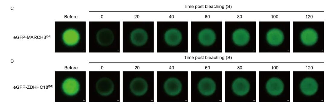 为了探究细胞器膜如何招募cGAS,作者探讨了之前报道的两种分别定位在高尔基体和内体上的膜结合酶—ZDHHC18和MARCH8,并发现这两个细胞器膜结合酶在cGAS的膜定位过程中发挥关键作用。这两种酶的N端含有大量无序序列 (intrinsically disordered regions, IDRs),有助于将cGAS-DNA复合体招募至相应的细胞器膜。作者利用光遗传学系统、原位近邻标记(LOV-turbo)和体外重组蛋白实验系统,证明ZDHHC18和MARCH8的IDR可以在细胞内和体外环境中发生液-液相分离,形成可逆、动态的液滴结构(生物分子凝聚体)。这些凝聚体特异性地招募cGAS及其配体DNA至相应的细胞器膜,实现cGAS的“空间隔离”,并进一步对cGAS进行棕榈酰化和泛素化修饰,最终抑制cGAS的活性、防止过度免疫反应,从而实现对先天免疫信号的精确负调控。