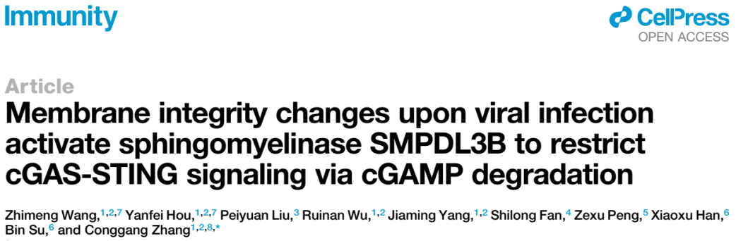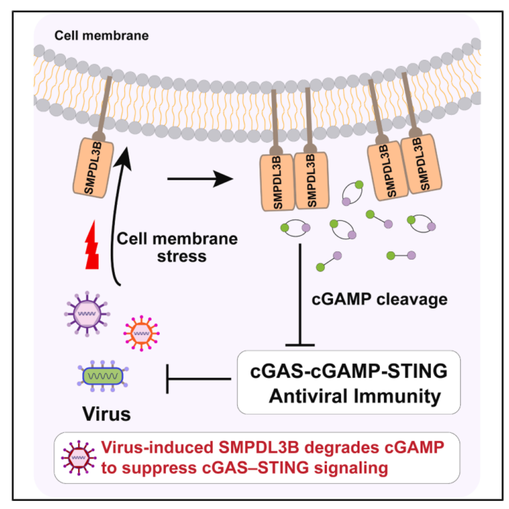 2025年10月31日,清华大学药学院张从刚课题组在Immunity发表了题为Membrane integrity changes upon viral infection activate sphingomyelinase SMPDL3B to restrict cGAS-STING signaling via cGAMP degradation的研究论文。该研究发现SMPDL3B是一种由病毒侵染诱导的cGAMP降解酶,病毒侵染诱导SMPDL3B的稳定和表达,进而抑制cGAS-STING天然免疫反应,有助于病毒的扩增。同时,机制上该研究发现SMPDL3B作为一种GPI锚定的细胞外膜定位蛋白,能够响应各种细胞膜完整性改变的信号,是一种潜在的细胞膜完整性感应器并介导免疫负调控。