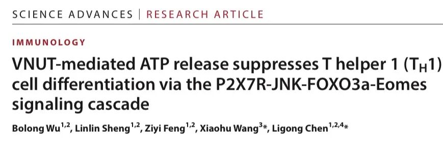 2025年12月19日,清华大学药学院陈立功课题组及其合作者以“VNUT介导的ATP释放通过P2X7R-JNK-FOXO3a-Eomes信号级联抑制辅助性T细胞(Th)1型分化”(VNUT-mediated ATP release suppresses T helper (Th) 1 cell differentiation via the P2X7R-JNK-FOXO3a-Eomes signaling cascade)为题在《科学进展》(Science Advances)杂志在线发表研究论文,该研究报道了ATP转运蛋白VNUT通过调控P2X7R-JNK-FOXO3a-Eomes信号通路对Th1细胞的分化产生了调控作用。
