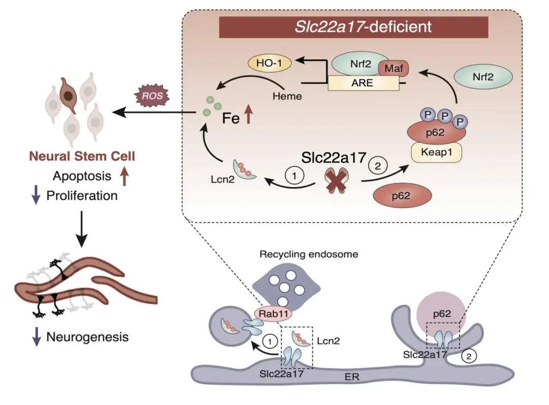 综上所述,Slc22a17缺失导致神经干细胞内铁异常积累,活性氧过量,引发细胞凋亡,从而严重抑制神经发生并引起早期死亡。机制上,Slc22a17通过与p62相互作用调控Nrf2/HO-1信号通路,其缺失进一步加剧铁相关氧化应激。此外该研究还发现,Slc22a17主要定位于内质网,可能作为上游铁调控枢纽,通过回收内体途径促进铁的外排。本研究揭示了Slc22a17作为海马铁传感器和转运关键分子的独特作用,阐明了铁稳态、氧化应激与神经发生之间的紧密联系,为铁代谢相关神经发育障碍及认知记忆功能障碍的治疗提供了新的潜在靶点和治疗方向。