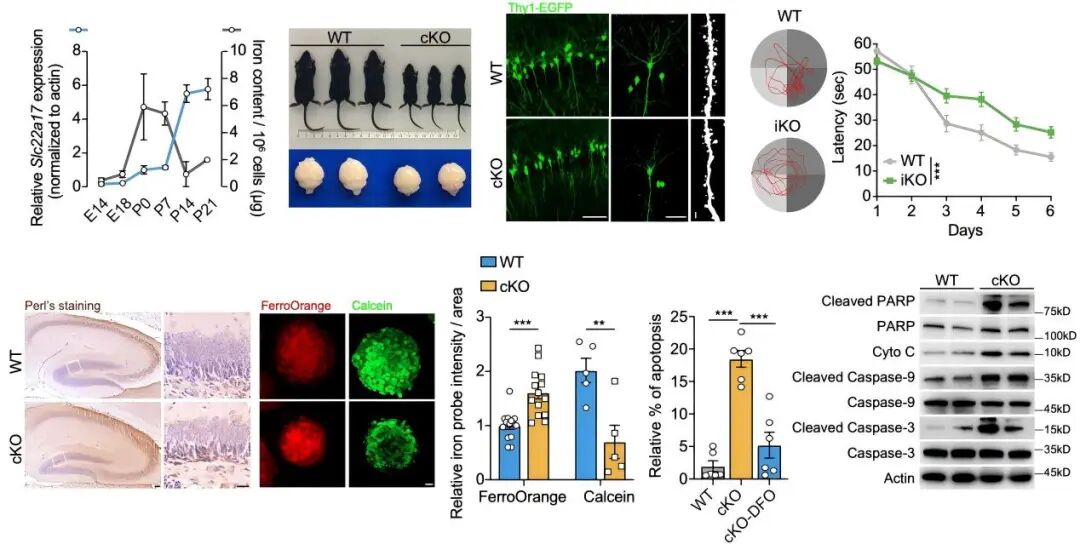 在该研究中,转录组结果显示Slc22a17是海马中表达最丰富的铁转运蛋白之一。作者发现在胚胎第14天至出生后第14天这一关键发育窗口期,神经前体细胞内铁含量呈现先升后降的动态变化,与Slc22a17的表达水平呈负相关,提示Slc22a17在早期神经发生过程中调控神经干细胞铁稳态的可能性。为了探索Slc22a17在中枢神经系统中的功能,作者构建了Nestin-Cre介导的Slc22a17条件性敲除小鼠,系统地探究其在神经发育中的作用与机制。研究发现,Slc22a17缺失导致小鼠严重的生长发育迟缓和高死亡率,并显著损伤海马神经干细胞的增殖与分化能力。进一步研究发现,Slc22a17不仅对发育期神经发生至关重要,也在成年神经发生中发挥核心作用,Nestin-CreERᐪ⟡介导的成年诱导型敲除小鼠在学习与空间记忆行为学中表现出明显缺陷。