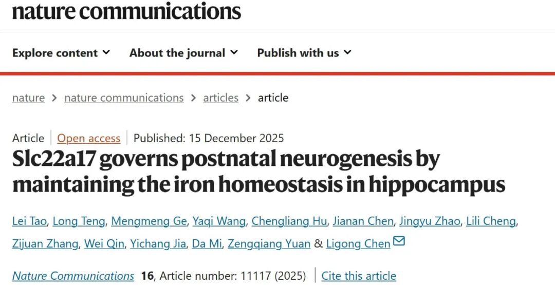 2025年12月15日,清华大学药学院陈立功团队在Nature Communications杂志发表了题为“Slc22a17 governs postnatal neurogenesis by maintaining the iron homeostasis in hippocampus”的最新研究成果。本研究首次揭示了SLC22A17通过调控海马神经干细胞内的铁稳态在脑发育期及成年神经发生中发挥关键作用,提出了其与自噬接头蛋白SQSTM1/p62互作,调节Nrf2/HO-1信号通路、维持氧化还原平衡的分子机制,为理解铁代谢失衡导致的神经发育障碍及相关神经退行性疾病的防治提供了新的理论依据与潜在治疗靶点。