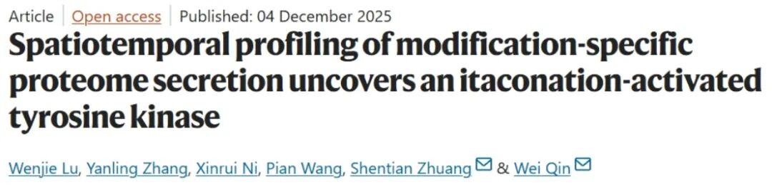 2025年12月4日,清华大学药学院秦为课题组与中国药科大学庄申甜团队合作,在Nature Communications上发表题为“Spatiotemporal profiling of modification-specific proteome secretion uncovers an itaconation-activated tyrosine kinase”的研究论文。该研究发展了一种名为“PTM-based secretome profiling(PBSP)”的新型化学蛋白质组学技术,实现了对携带特定翻译后修饰的分泌蛋白的时空动态追踪,并揭示了衣康酸修饰通过激活酪氨酸激酶FYN调控细胞间通讯的新机制。该工作随后被Nature Chemical Biology杂志主编Russell Johnson选为当月“Research Highlight”文章。