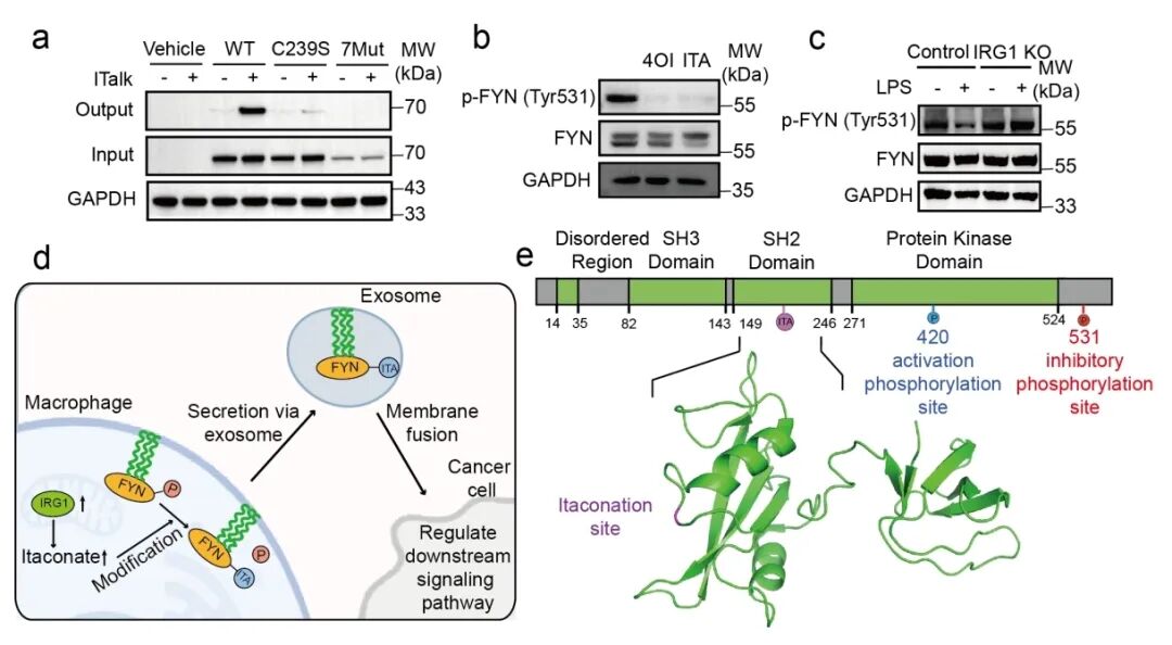 尤为引人注目的是,研究团队发现酪氨酸激酶FYN在Cys239位点发生衣康酸修饰,该修饰通过抑制其Tyr531位点的磷酸化,显著增强FYN激酶活性(图2)。在IRG1敲除细胞中,LPS无法抑制FYN磷酸化,证明该调控依赖于内源性衣康酸。此外,FYN被发现存在于巨噬细胞来源的外泌体中,提示其可能通过外泌体介导的跨细胞信号传递,在肿瘤微环境等病理条件下调控受体细胞的信号通路。