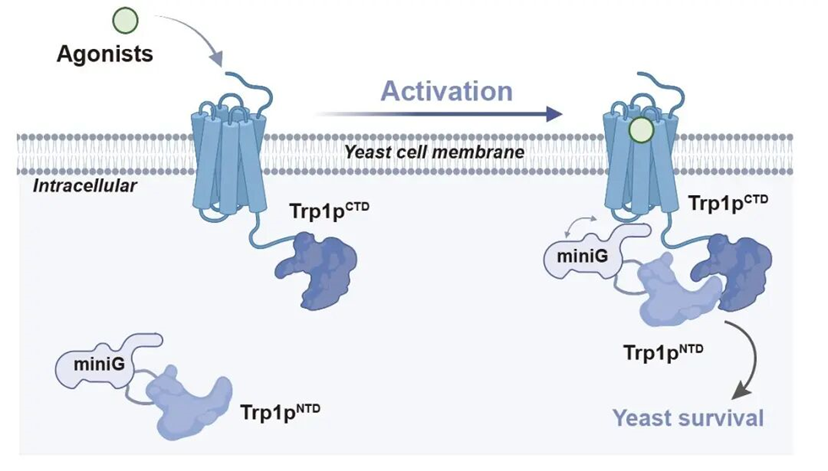 研究团队首先在酿酒酵母中构建了一种新型GPCR激动剂筛选系统。他们基于GPCR与G蛋白间的相互作用方式,将酵母色氨酸合成关键酶Trp1p拆分为两段,分别融合至GPCR和miniG蛋白。在GPCR未被激活的状态下,酵母因无法组装完整Trp1p而不能合成色氨酸,生长严重受限;一旦GPCR被激活,miniG被招募至受体附近,促使Trp1p组装完整,恢复色氨酸合成并加速生长。因此,通过监测酵母生长速率即可判断GPCR是否被激活。因为该系统利用生长压力开展GPCR激动剂筛选,故而被命名为“生存压力选择系统”(Survival Pressure Selection, SPS,图1)。