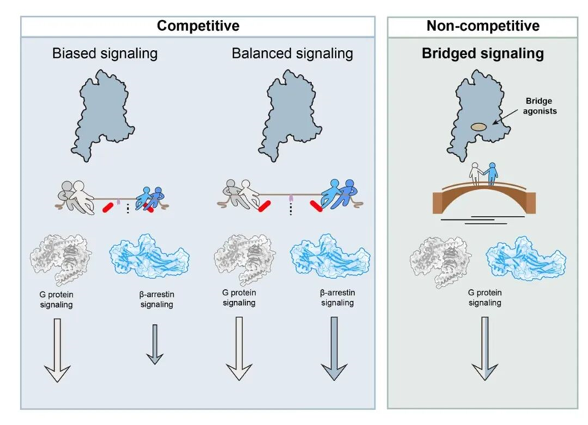 综上所述,本研究通过自主研发的“生存压力筛选系统”(SPS)高通量筛选平台,成功实现“老药新用”, 从已上市的临床药物库中挖掘出抗艾滋病药物阿扎那韦作为GPCR通用型正向别构调节剂(pan-PAM)。该分子通过稳定GPCR-G蛋白-β-arrestin超级复合物,实现G蛋白信号的持续激活。这一工作不仅为理解GPCR信号转导的复杂性提供了全新的视角,更提出了一条超越“偏向激动剂”策略的药物设计新思路。传统观点将GPCR下游的G蛋白和β-arrestin蛋白视为竞争关系,如同拔河比赛的双方。在这个理念下,平衡激动剂(Balanced Agonist)让双方势均力敌,而偏向激动剂(Biased Agonist)则让其中一方占据上风,不过本质上这两条信号通路还是彼此对抗的状态。与之不同,本研究揭示了一种全新的非竞争模式,其中G蛋白和β-arrestin蛋白“化敌为友”,携手调控下游信号。研究者们将其命名为桥接信号转导(Bridged Signaling)(图2)。在后续研究中,基于阿扎那韦的分子骨架进行结构优化,有望催生一类具有持续信号输出和低耐受性的GPCR靶向药物。