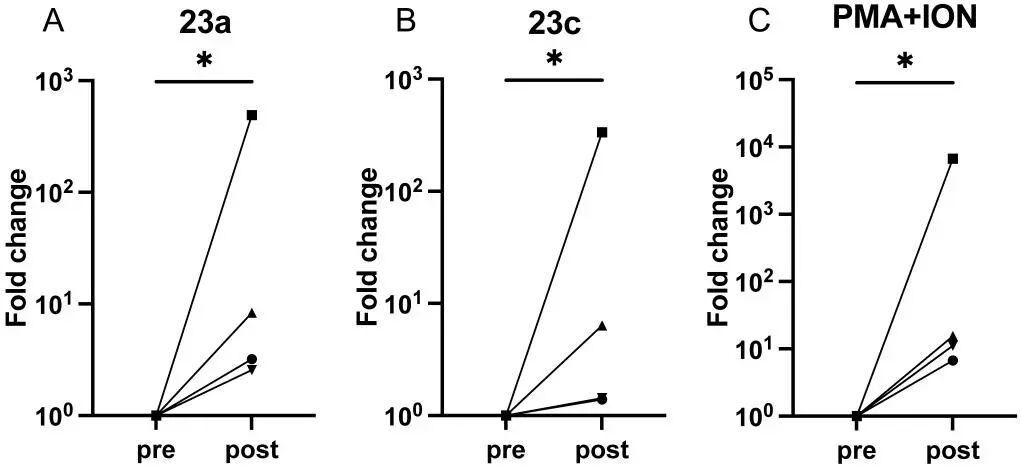 图2 TLR8激动剂23a和23c激活艾滋病患者的潜伏病毒库
