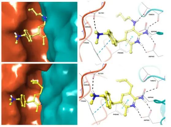 分子对接技术揭示了其高选择性的结构基础:23a 可与 TLR8 的 Thr586 残基形成特异性氢键,而 TLR7 中对应的 Thr574 残基构象向外,无法形成该相互作用,从而避免了交叉激活引发的免疫紊乱风险。同时,23a 的 N1 原子 pKa 值达 9.41,较对照化合物11a提升 1.57,增强了与 TLR8 关键残基 Asp543 的离子氢键作用,进一步提升了激动活性。
