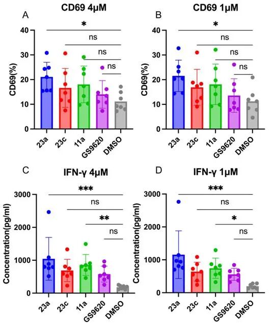 在 “Kill” 感染细胞方面,23a 可有效激活先天免疫中的自然杀伤(NK)细胞,使其高表达活化标志物 CD69,并大量分泌干扰素 -γ(IFN-γ)。激活后的 NK 细胞能精准识别并清除 HIV 感染的 CD4+ T 细胞,同时诱导患者 PBMCs 产生 TNF-α、IL-12等细胞因子,进一步放大免疫清除效应,形成对感染细胞的 “围剿” 闭环。
