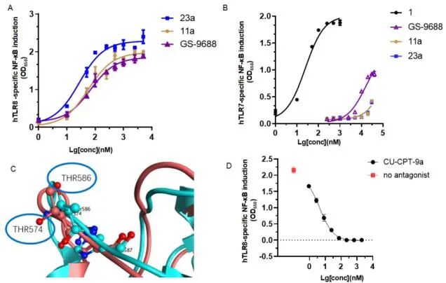 图1 TLR8激动剂23a与TLR8蛋白的分子结合模式,及其激动活性和选择性