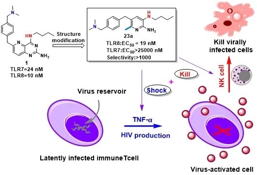 TLR7/8 作为识别病原体单链 RNA 的模式识别受体,其激活可启动先天免疫反应,成为 HIV 潜伏库激活的关键靶点。但此前 TLR7 激动剂(GS-9620)存在免疫激活效力不足、疗效有限等问题,而 TLR8 特异性激动剂的研发因结构优化难度大,始终进展缓慢。该团队通过结构导向药物设计,融合杂交策略与代谢优化,获得兼具高活性与高选择性的新型化合物。23a 的 TLR8 激动活性达 19 nM,对 TLR7 的选择性高于 1300 倍,显著优于TLR8激动剂 GS-9688(选择性低于100倍)和VTX-2337(选择性低于50倍)。