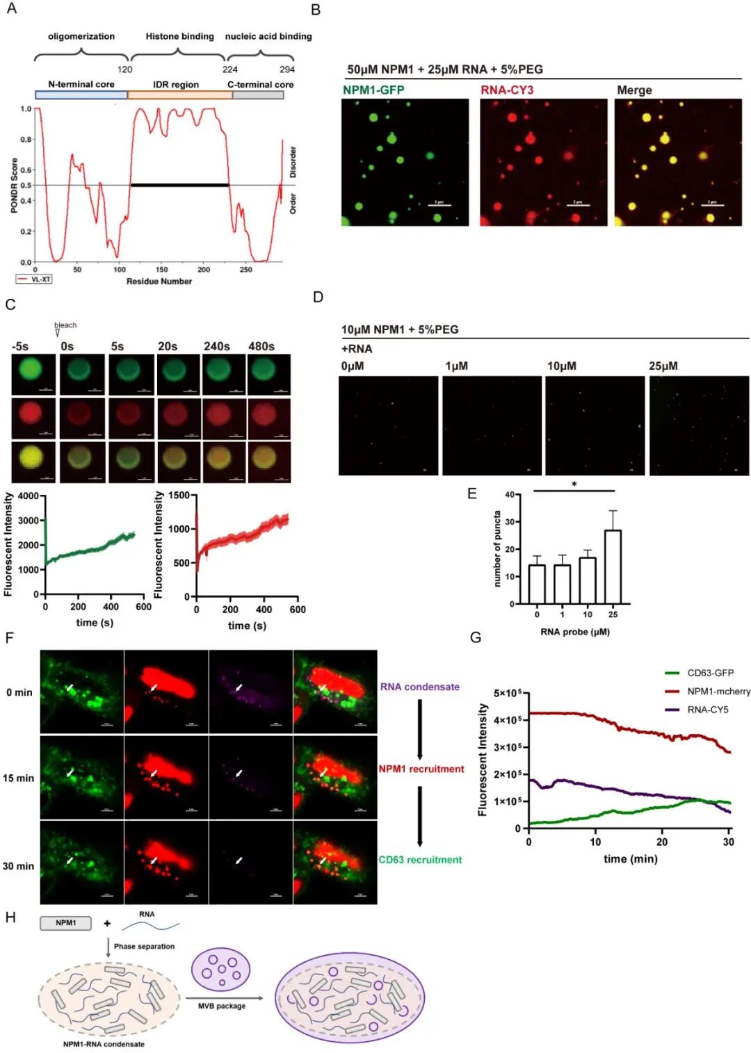 体外实验表明,NPM1可通过其固有无序区域与RNA形成动态液相凝聚体。RNA在凝聚体形成的过程中起促进功能。活细胞成像进一步显示,NPM1-RNA凝聚体可招募CD63标记的多囊泡体膜,促进其包装进入EVs。