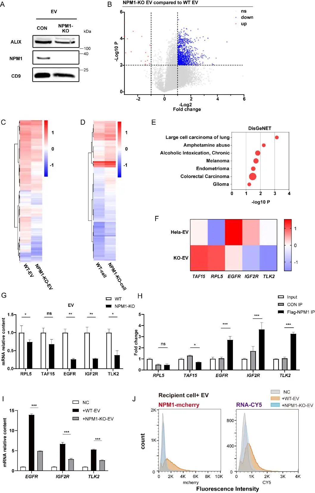 通过CRISPR-Cas9构建NPM1敲除细胞系,RNA-seq分析显示NPM1缺失导致EVs中多个癌症相关mRNA(如EGFR、IGF2R、TLK2)水平下降。RNA免疫共沉淀实验证实NPM1与这些mRNA直接结合。RT-qPCR与流式细胞分析技术证实NPM1可携带这些mRNA进入到受体细胞中。