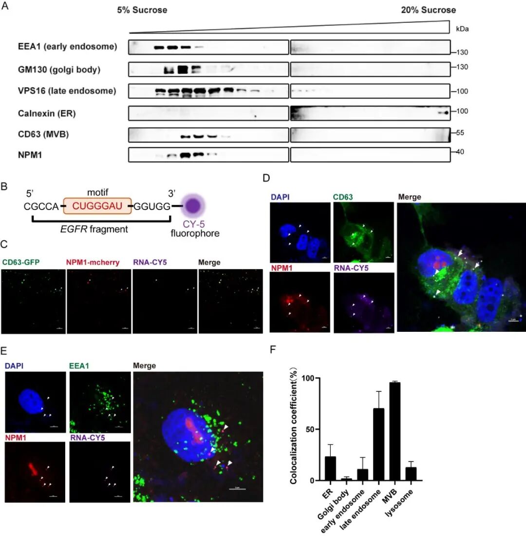 蔗糖密度梯度离心与高分辨率显微成像显示,NPM1与RNA在细胞内共定位并主要富集于CD63标记的多囊泡体中,提示NPM1-mRNA复合物通过晚期内体-多囊泡体途径进入EVs。