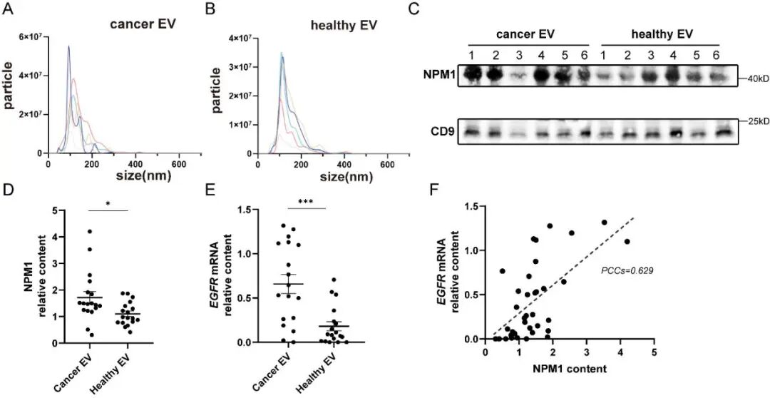 在18例NSCLC患者与18例健康对照的血清EVs中,NPM1蛋白与EGFR mRNA水平均显著升高,且两者呈正相关,提示该机制在肺癌中具有潜在临床意义。
