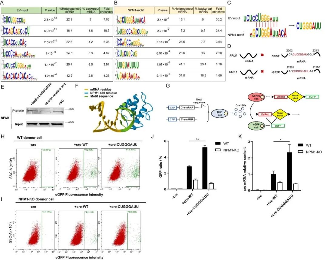 通过生物信息学分析鉴定出一个8核苷酸基序“CUGGGAUU”,该基序在EGFR等癌症相关mRNA中存在。通过RNA-pulldown技术验证NPM1与该基序的特异性结合能力。利用Cre-LoxP报告系统验证,将该基序连接至Cre mRNA的3’端可显著增强其通过EVs递送至受体细胞的效率,且该过程对NPM1具有依赖性。
