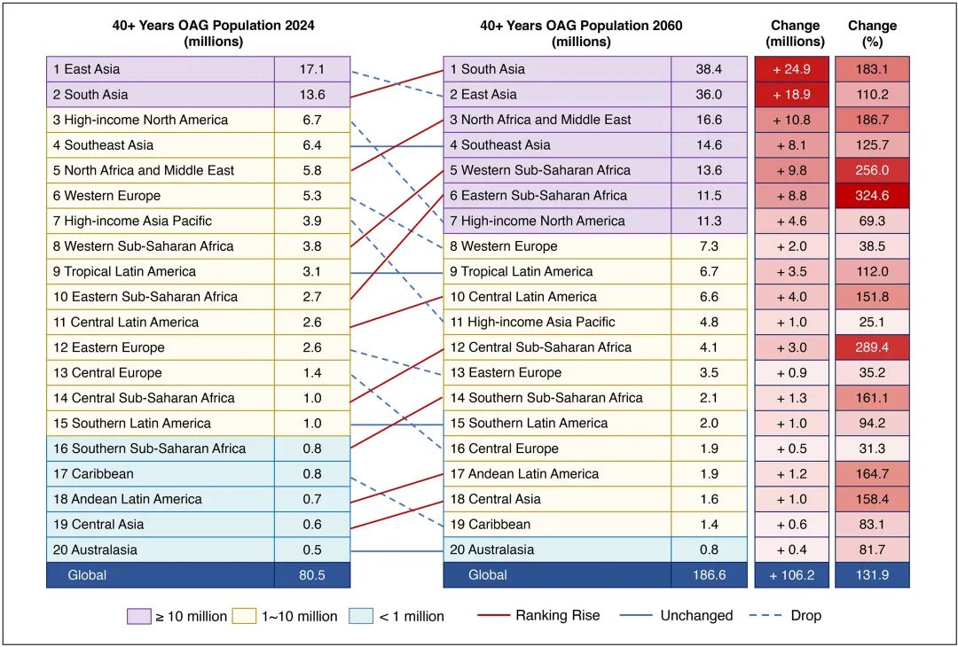 受近视流行影响,东亚OAG患病率预计从2024年的2.3%提升至2060年的3.4%,以其50.5%的相对增幅高居全球第一。东亚OAG患病人数将从2024年的1710万上升至3600万,在新增的1890万病例中,高达64.0%(1210万)与近视流行相关。