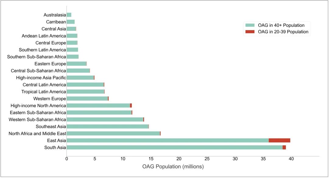 2060年全球20-39岁与40岁及以上人群中开角型青光眼(OAG)患病人数对比图