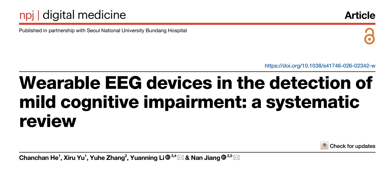 文章信息:Chanchan He, Xiru Yu, Yuhe Zhang, Yuanning Li & Nan Jiang. Wearable EEG devices in the detection of mild cognitive impairment: a systematic review. npj Digital Medicine. 2026;9:265. https://doi.org/10.1038/s41746-026-02342-w