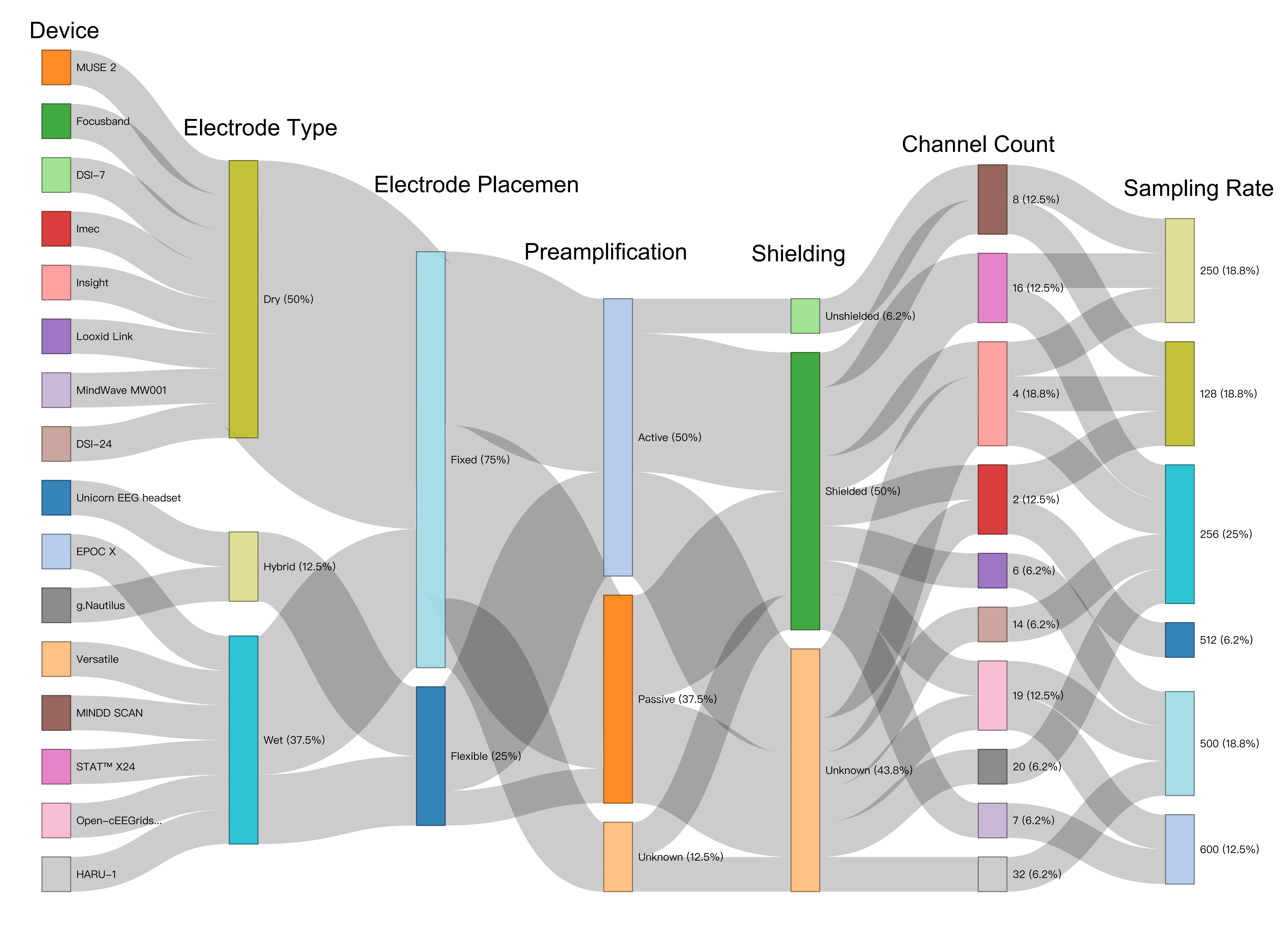 桑基图,展示了可穿戴脑电采集系统各项技术规格的组合分布情况