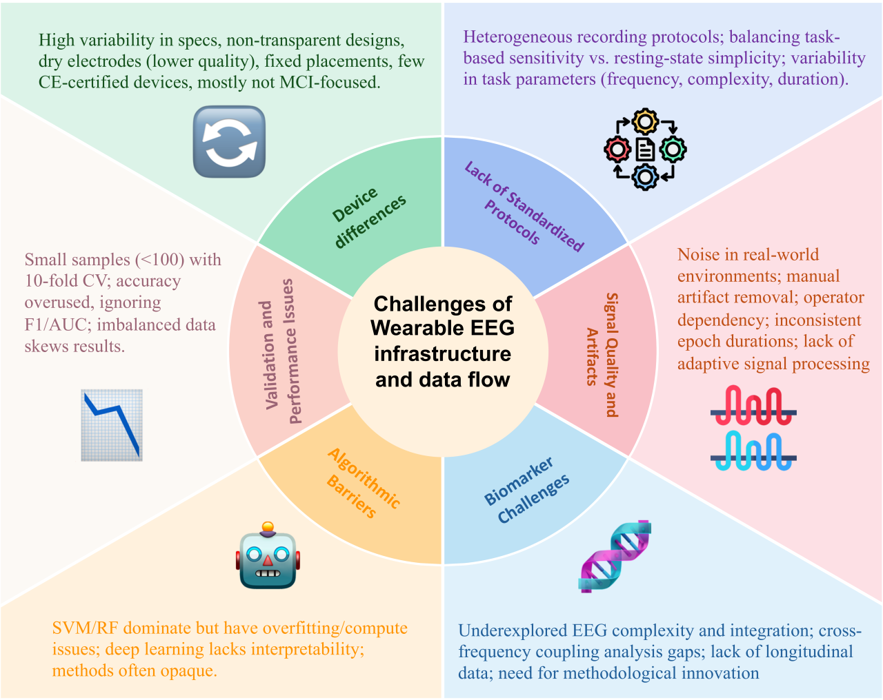 尽管可穿戴EEG在轻度认知障碍筛查中展现出一定应用潜力,但系统性分析表明,其从实验室走向真实世界应用仍面临多重挑战: