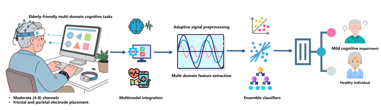 ③ 适老化多维认知任务(Elderly-friendly multi-domain tasks):采用覆盖注意力、工作记忆等多认知域的任务范式,相较静息态更有利于特征提取;同时通过简化任务设计提升老年用户依从性与数据质量。