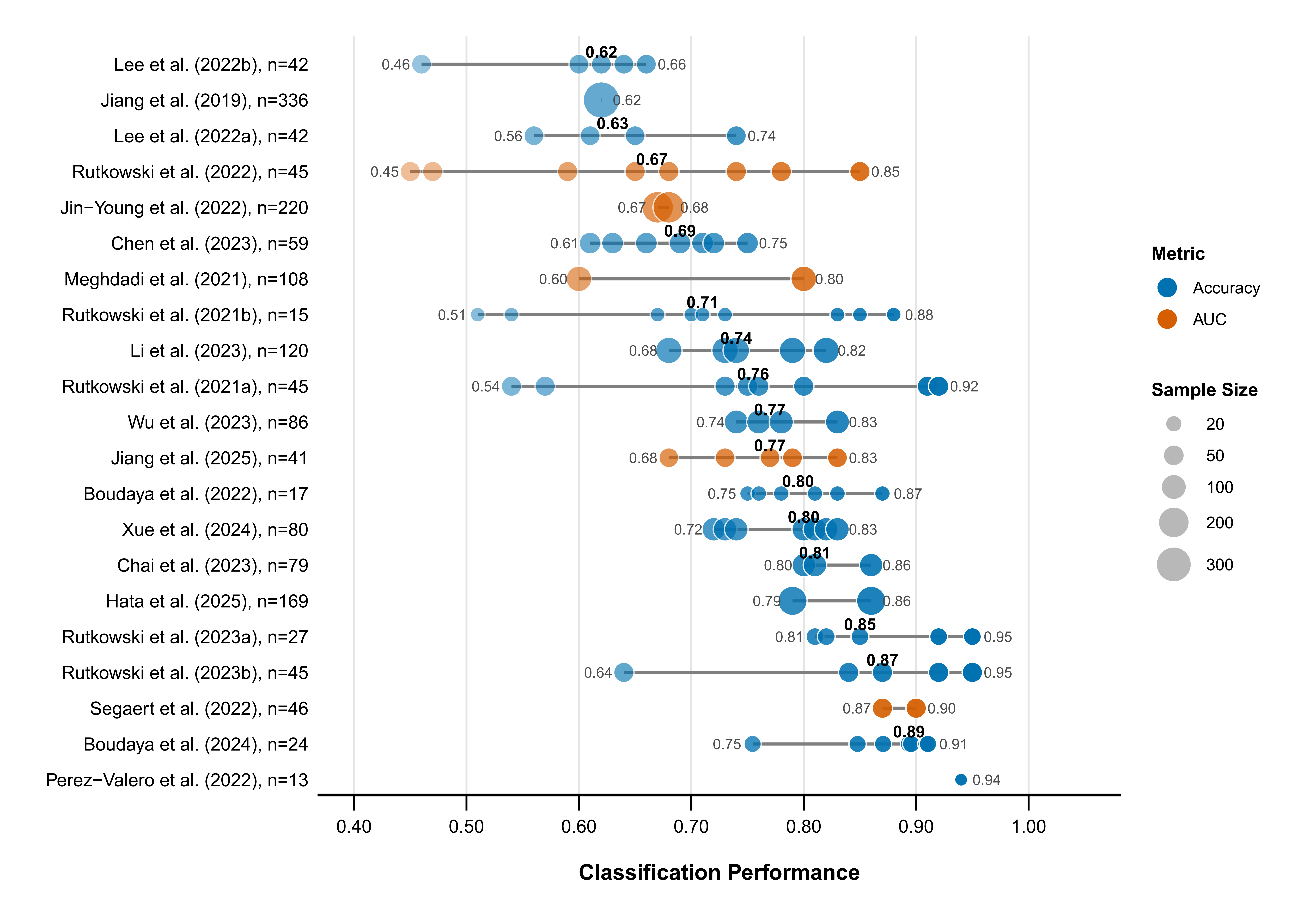 ⑥ 模型验证与评估不足(Validation and performance issues):小样本研究中十折交叉验证易高估模型泛化能力,多数研究仅报告准确率,忽视F1值、敏感性及AUC等指标,难以全面反映模型在不平衡数据下的真实性能。